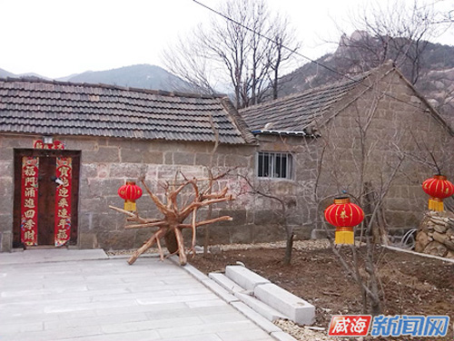 终于下山了,小路边有一座农家小院,屋前干净的庭院,造型漂亮的树根,大红的灯笼张扬着喜庆,古朴与现代的结合,构成了一道别样的景致。