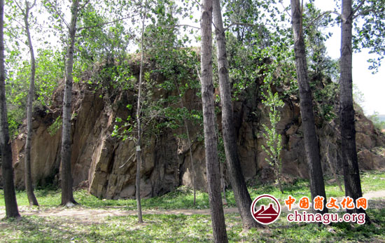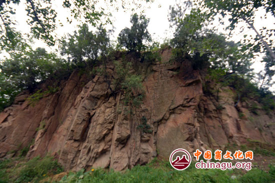 实地细看,此崮在四周都是平地处突兀而出,孤零零的,无任何山脊与其它相连。东北处悬崖高约20多米,由花岗岩、片麻岩构成,且岩石的缝隙都是直立的。而周边的山崮均是石灰岩和页岩构成,唯花崮子独树一帜,实在怪也。