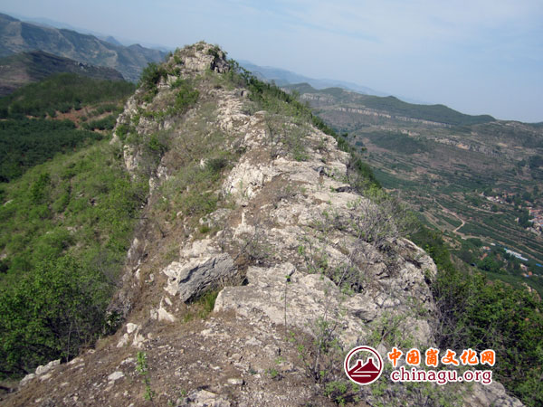 崮文化网讯 界石崮位于中国岱崮地貌中心以北的沂源县中庄镇境内,东西走向,主峰海拔594米,由石灰岩、页岩、亦有少量片麻岩构成。该崮四面悬崖,长200多米,主峰顶部最宽处不过40米,东首最窄处才2米左右。崮之阳为耿家庄村,崮之阴为焦家上庄的靳家峪自然村。从远处的西北方向来看,此崮犹如一条卧龙,静静地酣睡着。我们也曾从鹰嘴崮北眺,该崮横亘东西,好像一道石长城,雄起于周边群山。