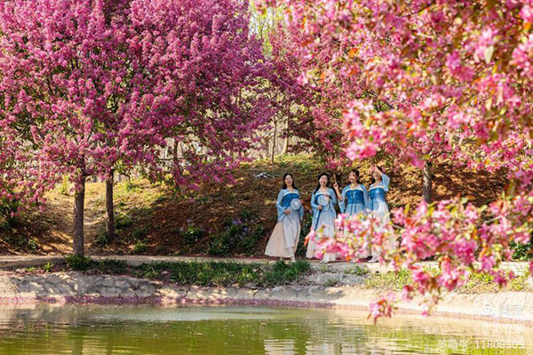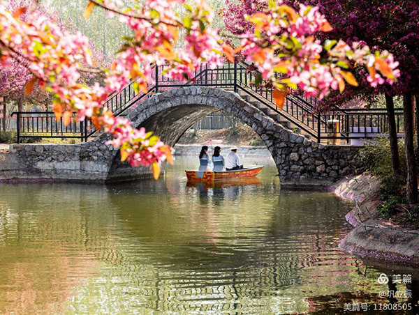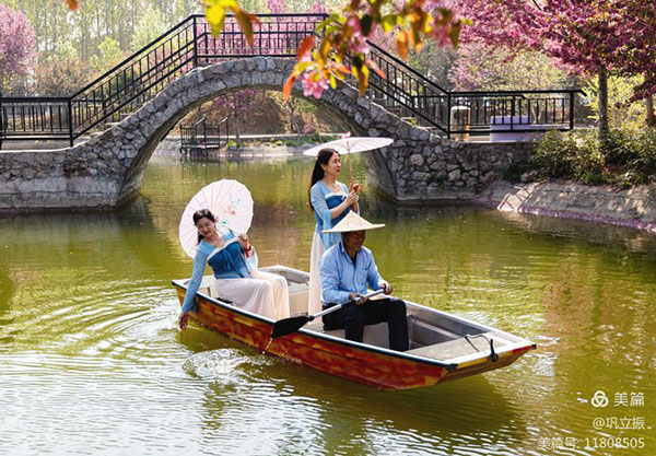 蒙阴界牌刘长增,培植桂花早有名, 建园历经三十年,旅游科技皆好评。 花圃界牌咫尺东,二零五道南平行, 各型特色四百亩,金银丹桂数十种。 五千余平温室棚,数千米之幽花径, 各类桂花列两边,八月馥郁香气浓。 高杆精品各不同,青翠欲滴一丛丛, 巨石雕凿大花盆,有方有圆有三棱。 励精图治园扩充,又育海棠中国红, 二十余年数千株,几十品牌齐争容。 蒙山海棠鲜晶莹,朵大期长国艳称。 国内罕见为花魁,花簇密集少隙缝。 火红花团似球形,行行列队排齐整, 一米多高尽头远,娇艳妩媚眼帘映。 更有盆栽小玲珑,放置室内朝气生, 闲暇之余细观赏,精神愉悦心放松。 海棠花节人攒动,古装美女花丛涌, 桥上俯瞰或乘舟,欢声笑语穿桥孔。 石拱桥下水澄明,拱与倒影合圆洞。 繁花似锦遮桥栏,环顾四周在画中。 水边道旁人造岭,蜿蜒曲折花伴从, 万紫千红花锦簇,映入水面如照镜。 红花衬托绿叶青,花蕊金黄花瓣拱, 条条枝头点缀满,沾上雨露挂冰晶。 雨催花落亦是景,树下路面铺芙蓉, 踩上绵软像地毯,五彩缤纷胜天工。 蒙河流域沃土平,孟良崮可国道通, 南赏齐鲁第一桂,奇冠如盖绿葱茏。 进得园区感热情,或赏或购任君评, 好客山东沂蒙人,何时光临都欢迎!