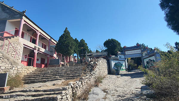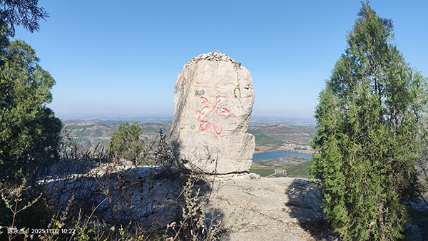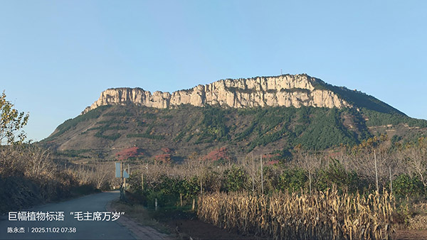 建筑群往南,过铁塔后,崮顶渐窄,再南走到鬼谷洞上方的车辙口处,一道东西向豁口割断崮顶,就是路的尽头了。抬头远眺,右前方高高昂起的即马头峰了。站在此处俯瞰,可以望见东麓开阔处斜坡上的“毛主席万岁”巨幅植物标语,因视角原因,只能望见其中的二三个字。1959年3月,当地群众用百万株柏树栽植而成由“毛主席万岁”五个大字组成的巨幅植物标语,占地面积276亩余,在高德卫星地图上清晰可见。特定历史时代的产物,今天却成为一笔宝贵的财富,已被世界吉尼斯大全上海总部命名为“植物标语中国之最”,成为马山景区的一处网红景点。