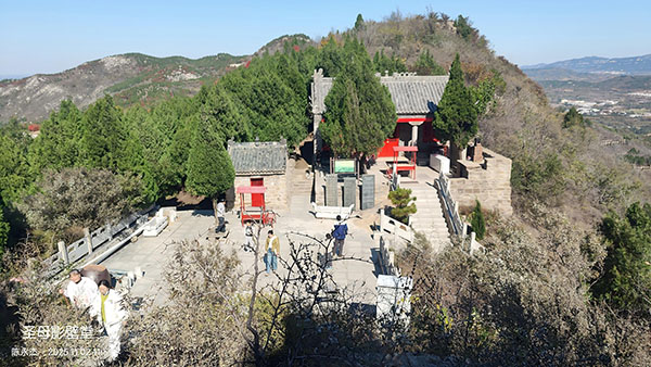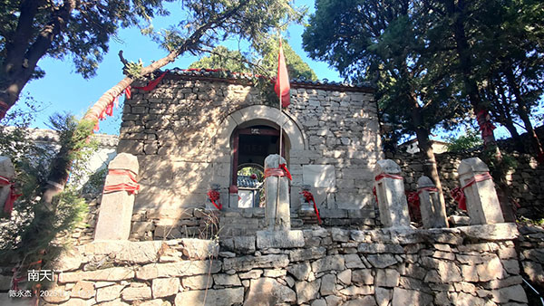 走在天街,崮顶宽阔处,南天门内就是崮巅庙宇建筑群了。建于春秋至明清时期的古建筑,清末时自北向南尚有灵官庙、丰施侯庙、天王殿、钟楼、后土殿、碧霞元君殿等,而今天看到的多为近年民间重修。据崮顶2008年所立《马山山顶三正殿简介》记载:“三正殿为玉皇殿、马山圣母殿、碧霞元君殿。原马山圣母殿,始建于春秋前,殿内塑有马山圣母神像。据碑文记载,唐贞观(十九)年(645年),山西龙门人薛仁贵奉旨东征,被困马山脚下,(因得一老妇之助)而获救,薛仁贵登上山朝拜时见马山圣母神像貌似老妇,回朝禀告太宗皇帝,遂逢马山圣母为‘丰施侯’,并拨银重修殿堂,再塑金身。”清康熙《济南府志》记载:“丰施侯庙,在隔马山。土人祀春秋时殖绰、郭最。”据史料分析,马山最早之神灵应为马山神(或称马山圣母),唐僖宗中和二年(882年)李公瞻在马山顶构筑隔马神君庙,供奉春秋时期齐国大夫殖绰和郭最,北宋时期朝廷封马山圣母为“丰施侯”,百姓俗称为马山奶奶。建筑群中部最高处为伟人堂,面北而建,堂内供奉毛、周、朱三位伟人塑像。古时每年的农历三月三逢庙会,方圆百里的百姓会到这里赶马山山会,沿袭至今已有近千年的历史。
