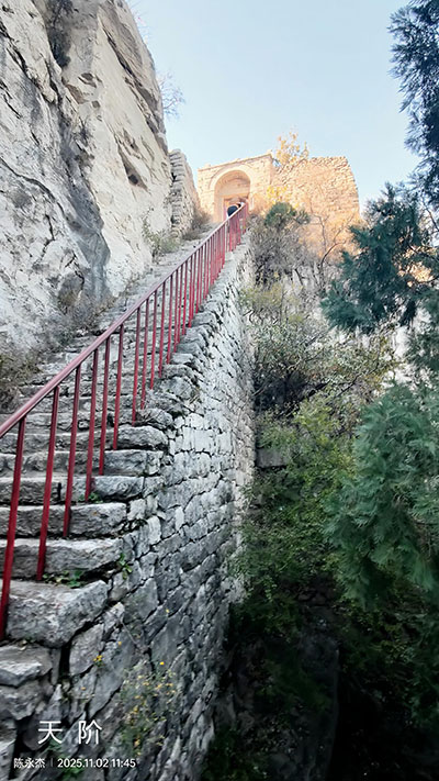 印台山以南悬崖上人工开凿出108级石阶,即为“天阶”,天阶依山势而建,陡峻险绝。东、西天阶尽头是东、西两座石砌天门,孤悬天半,造型古朴而坚固异常,均建于唐代之前,迄今未整修过,是马山保存较完整的原始建筑之一。