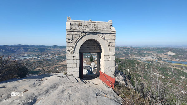 登上西天阶,进了西山门,即达崮顶。崮顶长500米余,最窄处仅约十米,而两侧崖壁如刀切斧削般,竟有百余米高。顶部却平坦,青石地面。自古便有“马山之胜在山顶”之说,那就一一来看吧。天门内青石平面上有粗线雕刻莲花和道士图案,不远处凿有长方形水池,长三四尺、宽两尺余、深尺许。另有“天池”“天阶”等摩崖数处及大小石臼数个。