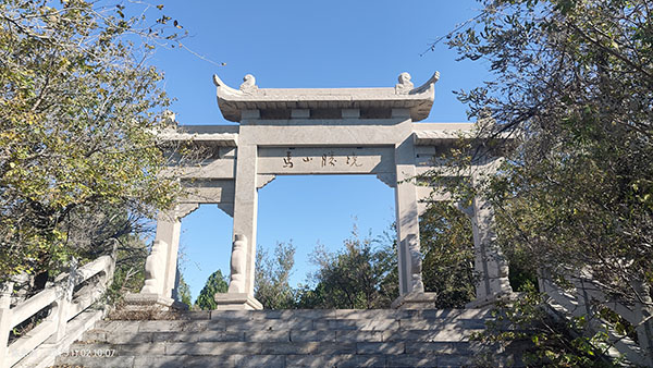 这一带路径草木很深,路迹较野,需要开启“火眼金睛”模式,小心又快速地通过。穿过乱石坡,走不多远即到上山台阶位置。这是个小岔路口,不要左拐下坡,要沿着台阶一直往上走,到达一处平台后,随即右转,来到马山主峰北首垭口的“马山胜境”牌坊处。牌坊北面一道山脊为“马尾”,为巨大岩块垒垛,两侧绝壁深渊。马尾附近有马尾泉、马尿泉、马尾洞、老鼠洞等泉洞。马尾西侧旧有道院“马泉院”,也称“马湾庙”。抗战初期,长清县抗日游击队成立并驻扎于此,因此,马山又是大峰山抗日游击队诞生地之一。