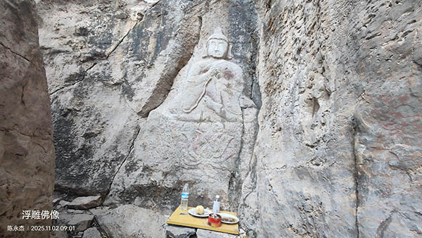 西侧洞口呈竖方形,出洞口随即右转,迎面石壁上雕有释迦牟尼半身佛像,通高1.7米,浅线浮雕,高肉髻,双手交叉胸前,赤足结跏趺外翻,端坐莲花座之上,胸前阴刻卍字纹,端庄中不失威严,有人称为“守门神”。佛像旁侧有危岩高耸如峙,中有石隙可通,此即“一线天”之景。