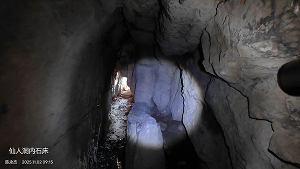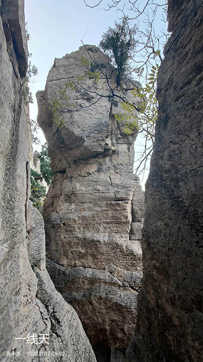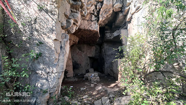 洞顶部为壁立千仞的车辙口,有人说西洞口外右前方不远立一巨石,上凿半米见方水槽,可承雨露,可惜自己当时不知情,也就未留意水槽。穿洞后向西侧下山可去往双泉镇,沿马山西崖底向北可去往崮顶。带老人和孩子来的朋友游览完“仙人洞”后,建议原路返回到石阶处,可轻松登顶。因为穿过“仙人洞”之后地势险峻,山路有点“野”了。