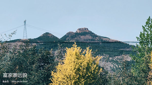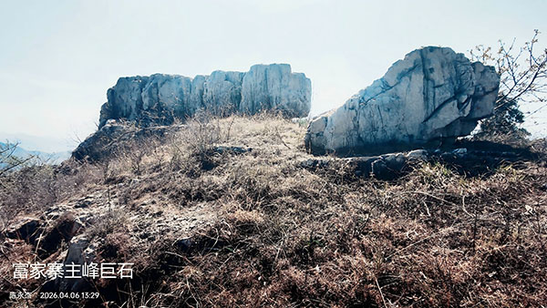 富家寨,当地人称“大寨”,位于山东省临沂市蒙阴县城东南11公里,云蒙湖西南3公里处的桃墟镇驻地以西,属蒙山山系。《蒙阴县地名志》(1983)记载:“富家寨,位于桃墟公社驻地西2.8公里,海拔606.8米,面积1平方公里。因富姓在此筑有山寨,故名富家寨。” 经中国崮文化网组织人员实地考察,认定富家寨是一座崮。2026年4月6日,我专程去探访富家寨。沿着曲折的村村通水泥路,将车停在大李家林村东一户人家门口,向站在门口的大爷、大娘问路后,沿着村东小路,朝着崮北侧的一道山梁走去。疏林荒草间有小路,两侧多软枣树,枝头已生新芽,抬头望去,红中泛黄,舒张如婴孩的小手,和初生的香椿芽差不多。