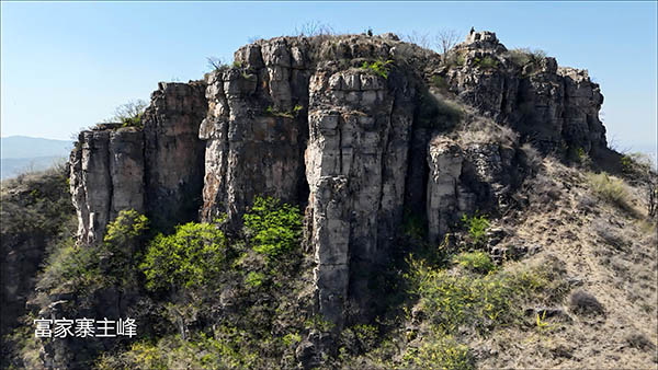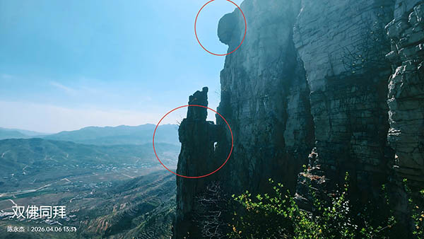 崮顶山寨的东头是崮的至高点,再往前则是悬崖峭壁。攀到至高点,发现主峰顶部面积不大,却很平坦,上面卧着两组巨石,横平竖直,状如豆腐块,表面粗糙,侧面竖向纹理分明。地面留有不少垃圾,我在西面的石屋残迹间转悠时,望见东面山头上四五个人,有男有女,有大人有孩子,现在已经下山了,这些垃圾应该是这家人刚才留下的。这么多年的户外,我一直坚持三个原则:不带火种、不留垃圾、不搞破坏。 爬上巨石,周边一览无余。以主峰为中心,向四周延伸出五六道山梁,其中以东西两侧为主,和主峰共同组成一道东西向绵亘近5公里长的山脉,可以称之为富家寨山脉。崮顶主峰东、南两侧悬崖陡立如挂,岩石久经风雨侵蚀,风化成岩柱,贴在基石上,摇摇欲坠,远望岩柱形如手指。下到东侧,我观察到一组奇特的岩柱,下部一根高约十几米,与岩体若即若离,其形状,酷似头戴毗椤伽摩尼宝冠、面朝东方膜拜的一尊观音。而上部山体突出的一块巨石,侧面望去如一尊面朝东方膜拜的佛陀,神形毕肖。今天无意中发现“双佛同拜”这一奇观,让我心中充满欢喜。大自然依然充满未知与美妙,只要保持观察与好奇,我们会在不经意的角落,发现惊喜与神奇。