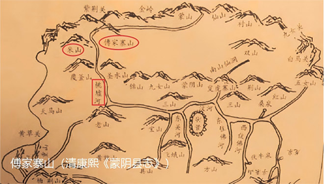 除了崮顶山寨、崮貌风光外,富家寨似是乏善可陈,但其周边,却是自然人文景观众多,文化底蕴深厚。富家寨以东四五公里的湖水之下,曾是有名的古蒙阴八景之一“汶水拖蓝”发生地。据说汶水与桃墟河汇流处,水深变蓝,映上青天,天水一色,蔚为壮观,这就是“汶水拖蓝”之景。过去有不少文人墨客到此游览,填词赋诗,盛极一时。清宣统《蒙阴县志》记载:“汶水拖蓝在城东25里苏家后之西,桃墟河与东汶河汇流处,其中独有方广数丈,经冬不冻,其下必有泉脉所出也。”“汶水拖蓝”之景西南二三公里处,富家寨崮前,桃墟河北岸,有一古村名大庙,春秋时期即有人居住,因建有一座“刘十八郎庙”,规模宏大,故名大庙。故址今重修为玉皇庙。附近为明末蒙阴贡生、阶州知州王询祖居、读书、隐居之地。再西不远有省级文物保护单位鲁王台,传为鲁宣公读书处(王询、鲁宣公事迹见拙文《富家寨下鲁王台》)。