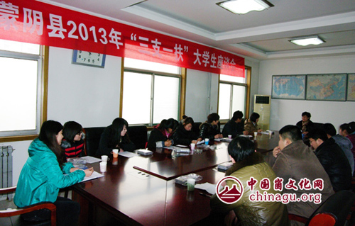 崮文化网讯 1月29日,蒙阴县2012年度“三支一扶”大学生座谈会在县人力资源和社会保障局会议室召开,全县29名“三支一扶”大学生参加了座谈会。