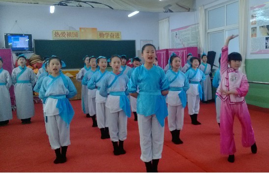 孩子们为妈妈们奉献了一台精彩的文艺演出:合唱——《小乌鸦爱妈妈》,手语——《感恩的心》,诗朗诵——《母爱如歌》等。图为小学生们表演配乐诗朗诵《游子吟》。(马小跳)