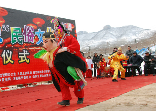 崮文化网讯 2月7日,首届岱崮地貌民俗文化节在岱崮地貌核心地岱崮镇隆重开幕,为即将到来的新年增添了亮色,尽管当日寒风凛冽,气温较低,但依然挡不住崮乡群众欢乐喜庆的心情。