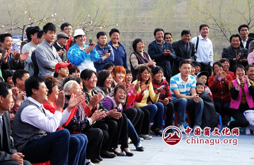在岱崮村的桃园中临时搭建的舞台上,娇艳的桃花、巍巍群崮以及笑意盈盈的群众,营造出一个快乐乡村的场景。由主持人、演员和当地文艺骨干等表演的一系列反映沂蒙崮乡风土人情、旅游特色的节目精彩纷呈,或幽默搞笑,或催人泪下。引得大家笑声、掌声不断。