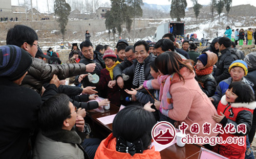 崮文化网讯 2月13日,“蜜桃哥”娄承旺演唱歌曲专辑暨唱片赠送仪式在岱崮地貌民俗文化节上举行。蒙阴县人大原副主任邢俊普,蒙阴街道东关社区党支部书记、山东东蒙企业集团董事长赵玉林为专辑揭幕。 娄承旺是岱崮镇先头峪村的农民,自幼喜欢唱歌,他那浑厚的男中音唱出了崮乡原生态的独特风味,唱出了新时代农民的风采。本专辑共收录的娄承旺演唱的7首歌曲,均以岱崮地貌自然风光为背景制作而成,专辑一经问世,就引起了歌迷的强烈关注和追捧。(丁军国 摄影报道)