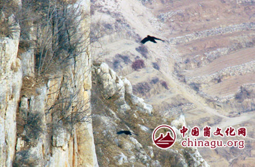 红嘴老鸹大多栖息在岱崮地貌的石灰岩高崮之上,吃食谷物、草籽、树木种子、昆虫和腐肉等。通体黑色,同一般乌鸦相似。嘴细长稍曲,呈朱红色。此鸟平时集群,但在当地数量不多,难成规模。这次在海龙嘴崮上用长焦拍到的画面显示大约有20多只老鸹聚集栖息在一起,是蒙阴县崮文化研究会登崮考察时发现的鸟群比较集中的山崮之一。(丁军国 摄影报道)