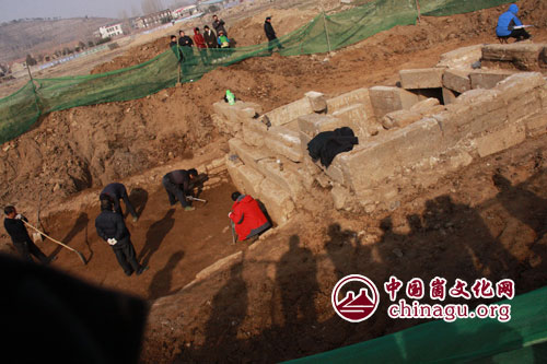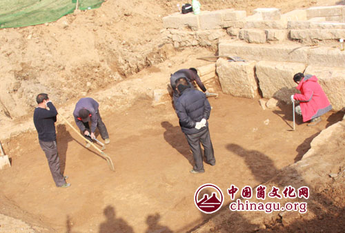 在发掘现场笔者看到,整个地宫坐落于旧寨大集向南100米左右的云蒙湖库底河床内。由于去年以来,天气持续干旱,云蒙湖水位下降,原本是一马平川的库底得以重见天日,这座藏于地下的地宫面目才逐渐显现出来。地宫近似正方形,周围架设了隔离网,文物管理部门和考古工作者正在有条不紊的工作着。从现场出土的巨型石条、陶片,以及建筑结构上看,这座地宫堪称规模宏大。参观者纷纷表示,这样的地宫无论是规模还是建筑样式在当地实属罕见。