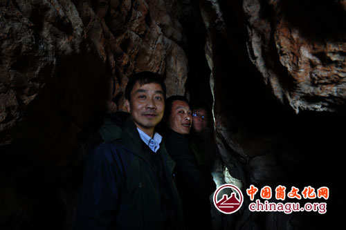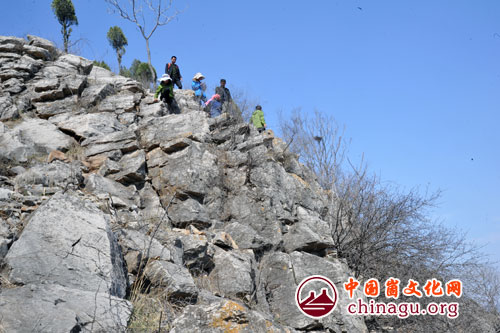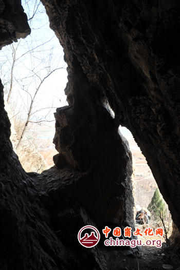 崮文化网采风团成员探秘尧山寨东南面崮崖上的山洞。