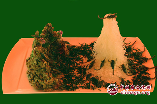 制作:全蝎、核桃仁、粉丝过油炸至酥脆,装盘即可。
