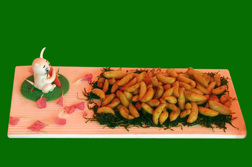 制作:用食油将蜂蛹炸至金黄,装盘即可。