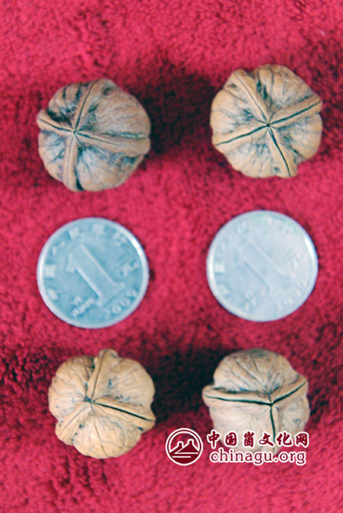 核桃和硬币一般大小,人们认为这是一个单独的品种。其实不然,赵先生收藏的这些小玩意,实则是蒙阴崮乡深山中古老的的核桃树遭遇百年不遇之大旱,仍顽强生长,与自然抗争,出落成的具有收藏价值的天然核桃艺术品。(丁军国)