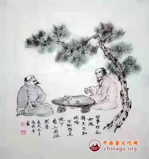 仙翁相邀品黑茶,松柏树下话桑麻。不同俗事纷扰争,闲看朝阳赏暮霞。