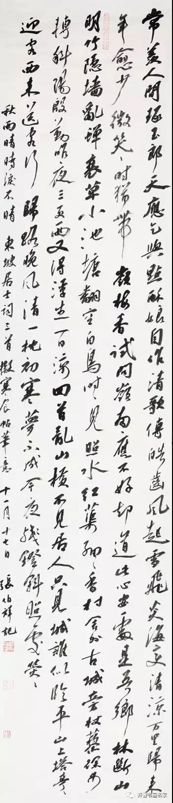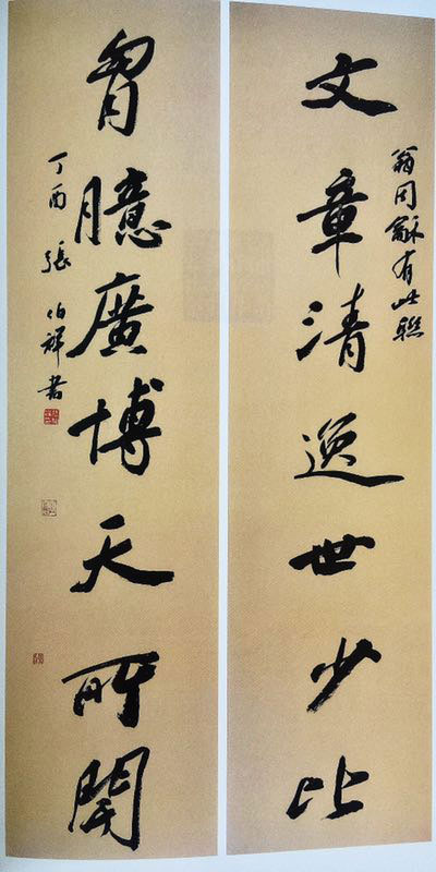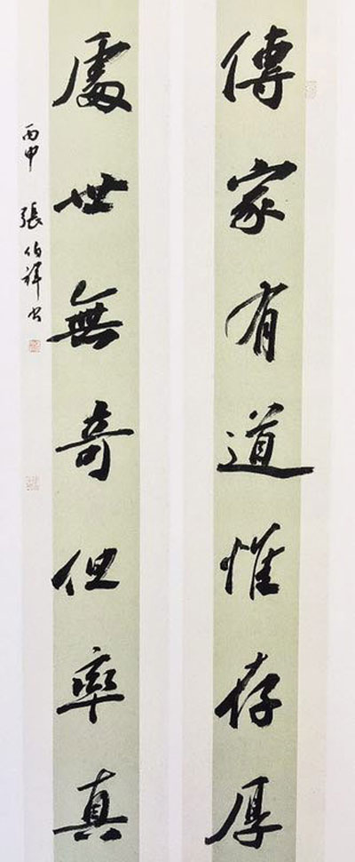 张伯祥的书法正走在文秀劲健,走向传统的幽深之处,走在面目渐渐清晰的时候。笙箫夹鼓,幽林曲涧,勃然而兴,溢于笔墨。他的书法带着那种天然的韧性与包容,带着强烈的传统气息逼人面目,但它不刺眼,不激烈,不造作,不是缠绵悱恻,而是直爽的、犀利的、优柔的、缱绻的,咫尺有万里之势,铺排有流韵之光,挥运如山风海雨,落笔有柔情衷肠。书法正在和他这个人融为一体,书法在改变或巩固着他的气质与格调,也在使他更加地理解传统贴近传统,更加虔诚地以传统的面目构筑着自己的精神世界。书法与人渐渐地融合着,书法的那种刻骨的真实与他密切地联系着,这本身就是一种成熟,一种健康。