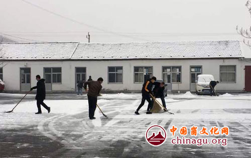 你扫雪,我铲冰,大家团结协作,将积雪进行铲除。扫雪的干部职工手、脸冻的通红,呼出的气体清晰可见,依然没有阻挡扫雪除冰的热情,不一会,院内积雪、主干道道路全部清理完成。(杨新新)