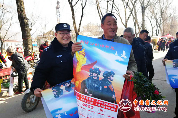 崮文化网讯 1月22日中午,山东省蒙阴县公安局岱崮派出所组织民警、辅警到辖区集市进行巡逻,向群众宣传防盗、防诈骗安全知识,并将印制精美的宣传年画与对联分发给过往群众,让大家在共享平安生活的同时,不忘提高安全防范意识,平平安安、欢欢喜喜过大年。(丁军国 窦怀雷)
