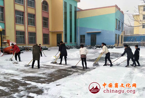 崮文化网讯 一夜飞雪,大地银装素裹,为保证2月20日学生开学安全,没有像坦埠镇中心幼儿园全体教师一大早集合在一起清理积雪,迎接明天开学。老师们有的拿铁锨,有的拿扫帚,全然不顾寒冷,投入到扫雪工作中。不一会就将全院的雪清理干净,老师们个个热的满头大汗,湿头发在空气中不断冒着热气。(杨新新)