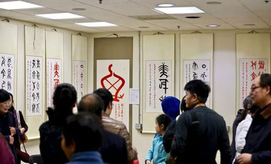 这里展示的是在中国山东省集中出土发现的东夷骨刻文临摹文字和书法艺术创作作品。东夷骨刻文是一种刻在动物骨头上保留下来的文字,已在山东发现2万多件。仅根据寿光发现龙山文化后期的一块骨刻碳14鑑定为已有3700年、上下交叉使用达3300~4600年以上的历史,这就是比甲骨文更早、传承至今没有中断的中国文字,它们将中国的文字历史推前了1300多年。