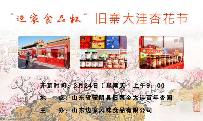 崮文化网讯 由山东边家风味食品有限公司主办的举行“中华老字号.边家食品杯”“杏福之旅,香约旧寨”杏花节将于3月24日(星期天)上午9:00在蒙阴县旧寨乡大洼百年杏园开幕。