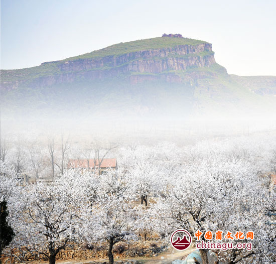 薄雾淡云飘山岗,三月小雨湿衣裳。满岭杏花绣枝头,放眼望去似海洋。