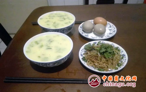 崮乡的豆沫不同于河北河南的精致特色小吃,绿色简单,也是过去充饥饱腹的口粮渐变而来,四时皆可做,是菜能入锅。豆沫做法简单天然:提前泡好的黄豆,用老磨推成嫩白如雪的豆沫,待锅里水烧开放入切好剁碎的菜叶,再放入磨好的豆沫,不一会便豆香四溢。冬季菜蔬少,最常吃的是白菜叶子,萝卜缨子。春天新鲜野菜陆续登场,选择就多了去了:苦菜,灰菜,蒲公英;荠菜,槐花,杨树芒子……新鲜的野菜做出的豆沫格外的鲜香味美。特别是苦菜豆沫,把挖来的苦菜洗净用清水泡上三两天,待苦味去的大半,捞出淘净剁碎,多放些豆沫下锅开煮,盛一碗,汤白菜绿,喝一口微微的苦涩里舌头说不出的舒展与安逸。至于杨树芒子豆沫,更别有一番滋味。柳牙欲出未露时,杨树花便开了。一个个红红的寸长的小骨朵,像成熟的谷穗挂满树梢随风飘动,又像毛毛虫一样悬在空中简直可爱极了。这时候是摘杨树芒子的最佳时机,再晚几天就发涩变苦。摘回家后,也是先用清水洗泡,再制作。杨树芒子豆沫口感极好,滑嫩鲜美,汤白味好,一顿一碗是不够的,再配着煎饼咸菜,怎么也得来两碗。只是快节奏的生活里,我们习惯了买现成的豆面,直接撒入,少了许多推磨的乐趣与豆浆的鲜美。