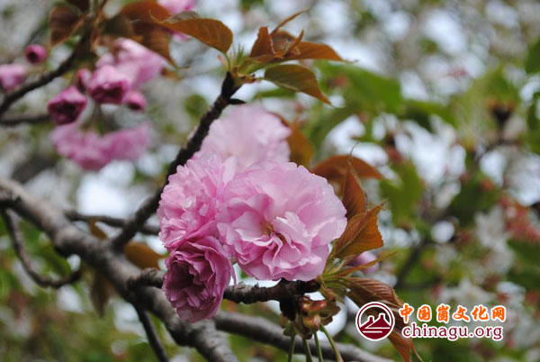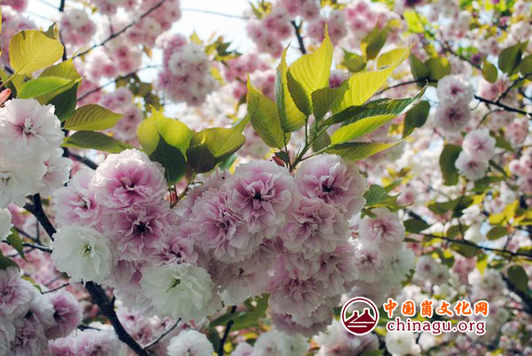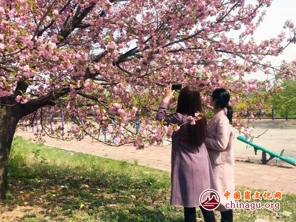 樱花品种不同,花色不一,颜色以红色、粉色、白色为主。白色樱花最为惊艳,初为雪白色,朵朵簇拥,随风飘摇。过几日,白色樱花花色变成粉色,花瓣粉白相间,甚是惹人。红色樱花颜色艳丽,傲立枝头。远观,成排的樱花树随风摇曳,颜色不一,甚是美丽,引得游人争相拍照留念。(杨新新)