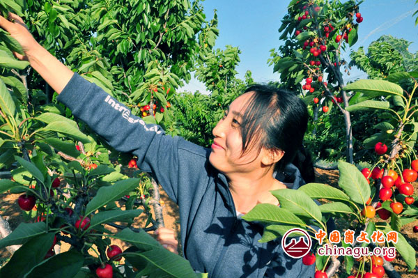 崮文化网讯 近日,位于龙腾崮下的蒙阴县联城镇小山口村第一年挂果的的大樱桃次第成熟,一串串晶莹剔透的果实挂满枝头,鲜艳欲滴的樱桃让游客们流连忘返。