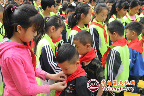 红领巾是少先队员的光荣标志,老队员为新队员佩戴上红领巾,当鲜艳的红领巾佩带在他们的胸前时,新队员个个神采奕奕,鲜艳的红领巾飘动在他们胸前时,队员们的脸上都洋溢着自豪而激动的笑容。 新队员代表的发言表达了全体新队员的心声,他们当以严格的标准规范自己的行为,努力学习,团结协作,牢记自己的光荣使命,争做新时代好队员。