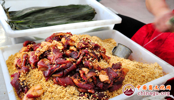 崮文化网讯 连日来,山东省蒙阴县联城镇常岭村的新蒙食品加工厂里十分忙碌,工人们坐在工作台前,灵巧的双手将粽叶重叠再折叠,卷成漏斗状后,用糯米充实压紧,再用绳一绕后扎紧,仅仅十几秒,一个个外观精美的粽子就诞生了。