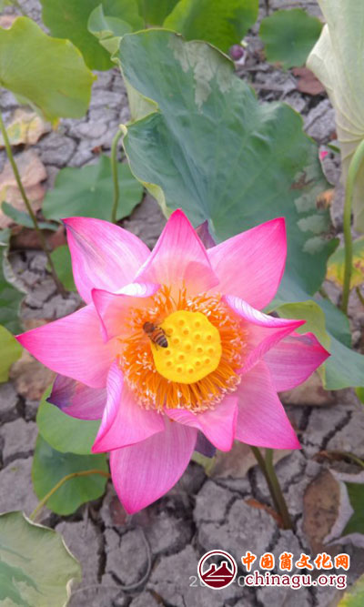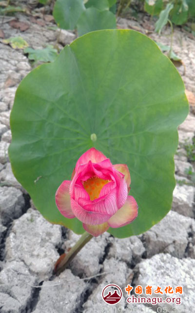烈日炎炎似火烧,荷塘干涸莲叶焦。荷花不惧干渴苦,夹缝求生依旧笑。