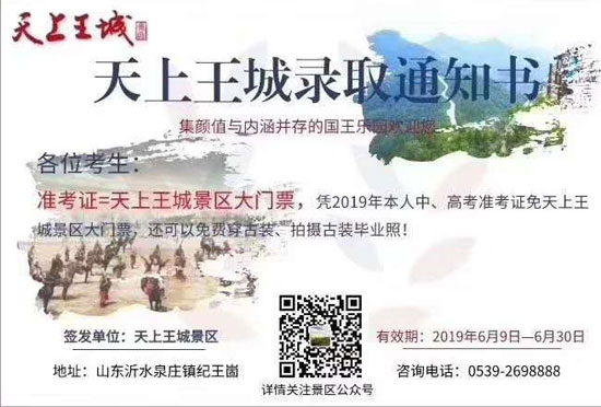 崮文化网讯 6月1日—6月30日,所有2019年中高考生持准考证游览天上王城景区免景区大门票,还可免费拍摄古装毕业照!(陈永艳)