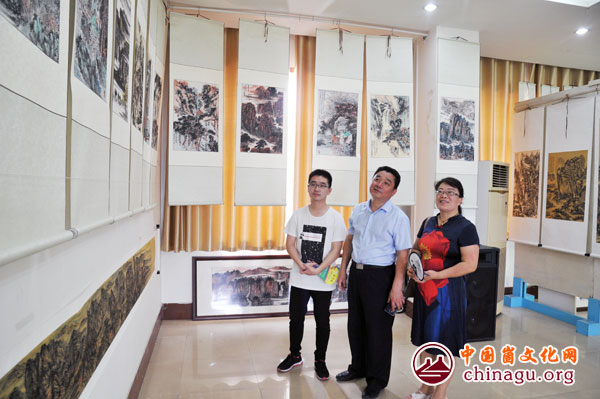 本次展览,共展出蒙阴县知名画家宋树学、王维的国画作品以及该县书画界的部分名人志士的贺展作品共200余幅,这些作品紧紧围绕“报答党恩,关爱发展”这一主题,把对党对祖国对家乡的无限热爱、对新时代的无比景仰和对幸福生活的崇高赞美之情凝聚笔端、融入丹青,从不同角度描绘了改革开放以来蒙阴县日新月异的发展变化。(丁军国 摄)