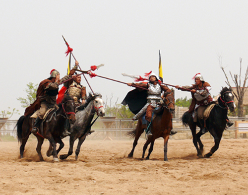 在宽阔的演武场,我们正好赶上演员们表演古代马战节目——王城之战。只见纪王的兵将和齐国的兵将正在决斗,战斗异常激烈。纪王的将士们越战越勇,打得齐国兵将只有招架之功而无还手之力。最后,纪王和他的将士们一起将齐国的兵将给俘虏了。我们观望着激烈的战争场面,仿佛听到了当时将士的呐喊,战马的嘶鸣,仿佛看到了那英勇作战的士兵,高举的旗帜飘扬……