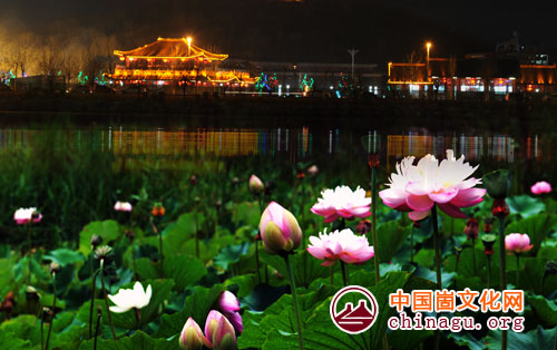 每过荷塘情亢奋,华灯流彩醉黄昏。清风识趣吹香去,碧水扬波锁韵魂。