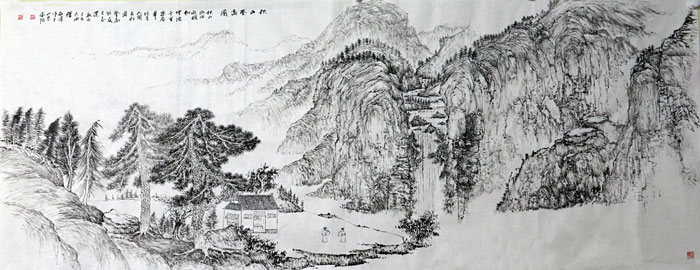 崮文化网讯 近日,职业画家、中国崮文化网特邀艺术家石伟做客蒙阴县蒙恬故里书画院,静心创作了一批大尺幅古代山水画。这些作品画面构图简洁,笔法秀润,或群山丛树,或烟云出没,或意境清疏,写实而生动,尽显宁静、深幽、气势宏大之美。
