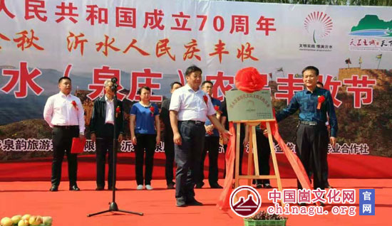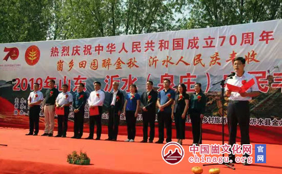 崮文化网讯 9月23日,山东·沂水(泉庄)2019年农民丰收节隆重举办。沂水县人民政府党组成员韩庆,县农业农村局局长张洪春,县委宣传部常务副部长赵光好,县广播电视台台长王洪涛,县互联网信息安全中心主任庄琳,县妇联主席辛惠,县果茶中心主任刘健,县文化和旅游发展中心副主任李发霞,沂水县诗词学会副会长、文峰诗社社长张克,泉庄镇党委书记李玉涛,山东峪泉田园农业开发有限公司副总经理李清明,泉庄镇全体机关干部,以及泉庄镇的广大农民兄弟、父老乡亲出席仪式。泉庄镇党委副书记、镇长、政协工委主任薛彦鹏主持庆祝仪式。