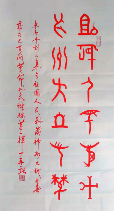崮文化网讯 10月1日上午,著名东夷文化学者、诗人、书法家,东夷骨刻文系统破译者、骨刻文书法艺术创始人、崮文化网顾问、山东省旅游行业协会副会长丁再献先生,在收看庆祝中华人民共和国成立70周年大会和阅兵式及群众游行等活动期间即兴集成了东夷骨刻文字“祖国人民万岁,神州大地长春”联句,随后用朱砂挥毫书写而成一幅书法艺术作品,以表达对中华人民共和国成立70周年的内心情感。特将其展示岀来,以飨读者。