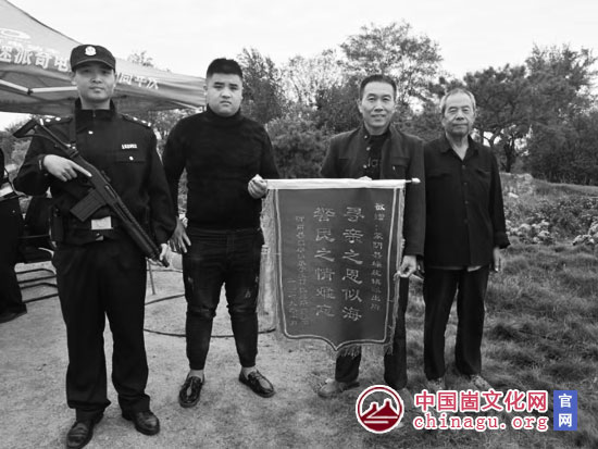10月5日,无比激动的老人家属将一副写着“寻亲知恩似海、警民之情难忘”的锦旗送到正在执勤的民警手中,向民警诉说着感激之情。(丁军国 张锋)