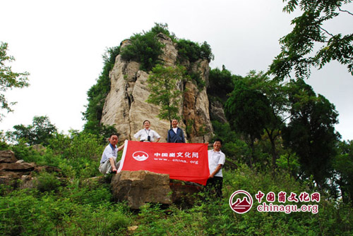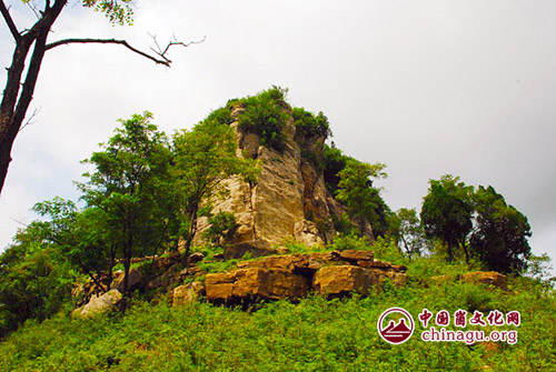 端坐与此石之上,由此东望,方见十几米处有山门耸立。所谓山门,就是南北各有山石垒就的石垛。这一段梯陡竖崖,直上直下,好几处无法下脚的地方,显见人为雕凿痕迹,类似蜀之栈道。这一处紧要地方,众人商量着:由徐志本老人为首,其余人等拉开距离,一一跟上。上去之后,当真叫苦不迭:原来此地人迹罕至,草木茂盛,莽莽苍苍,遮没了路径。幸喜徐老先生早有准备,手握一把剪刀开路。大家紧跟老人,亦步亦趋,穿行在茂林深草之间。但见蛛网密布,藤蔓缠树。有些山洞很深,大洞套小洞,洞连洞,里面错综复杂。还有一些小洞,据说是獾洞。“鹰眼鹿鼻獾耳朵”,獾耳朵好使,遇到生人造访,想是不知逃到哪里去了。大约进去三分之一的路程,开出一条路,走过去,站在南边悬崖边上,可以看到我们来时的路。大家不再前行,再原路返回,走来时开辟的道路,拉开距离,有序的一一下山而去。
