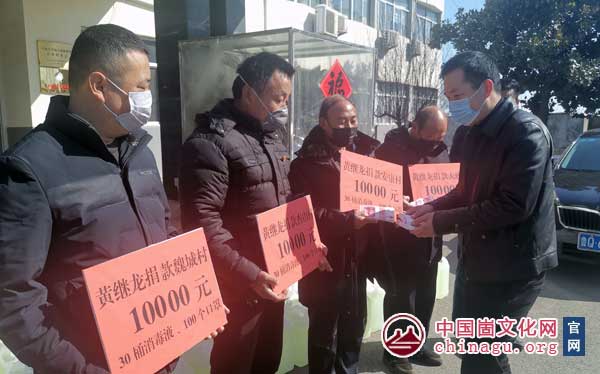 崮文化网讯 2月16日,桃墟镇金水前城项目负责人黄继龙、王莉娟通过县红十字会各捐助桃墟镇5万元,用于支援该镇抗击疫情。另外,黄继龙捐助桃墟镇大庙、前城、魏城、安康、杏山5个村各1万元,其中前城村口罩100个、消毒液32桶 ,其余村口罩各100个、消毒液各20桶。(张丙晓)