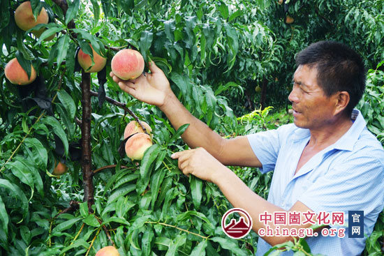 在他的带动下全村已发展这些不用人工授粉和套袋、省工、省钱、耐贮,色艳、脆甜、大果型的新品种蜜桃两千多亩。